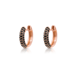 Micro pavé black diamonds set in 18K rose gold earring hoops.