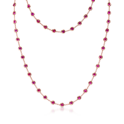 High-polished 18K rose gold with bezel set rubies. Lobster clasp.