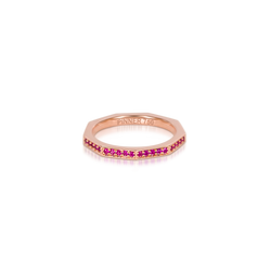 Micro pavé rubies set in nine-sided, 18K rose gold.