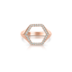 Honeycomb ring in high polished 18K rose gold, negative space with diamond pavé border.