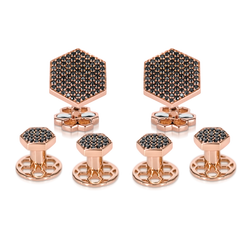 18K rose gold cufflinks with matching tuxedo studs, accompanied by our signature Honeycomb back. cufflink backs are hinged.