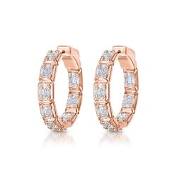 Round and baguette-shaped diamonds create these hoop earrings, set in 18K rose gold.