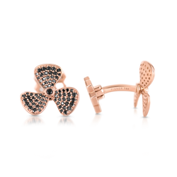 High-polished 18K rose gold propellers that spin, set with micro pavé black diamonds.